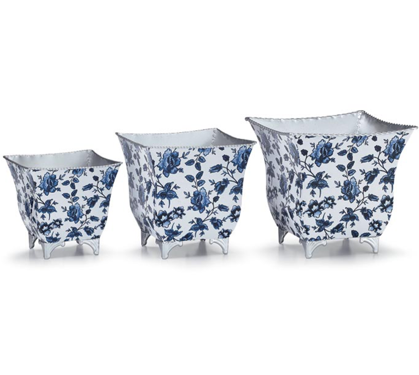 planters with a blue floral pattern around the sides. Has decorative feet and rope detail around the rims.