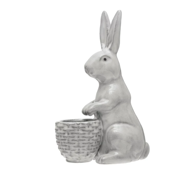 Spruce up your home decor with this Bunny W\basket Ceramic figurine. Perfect for holding tiny mercury glass ornaments or mini pumpkins, this versatile piece is a must-have for all seasons. Its ceramic material adds a touch of elegance to any space.