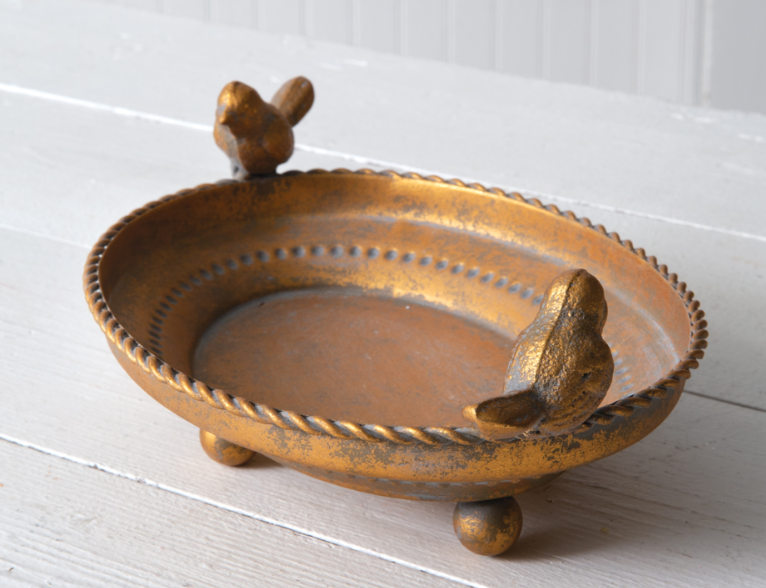 Feature your precious jewels or tealights inside this elegant trinket dish. Place on a vanity table or in a front entryway. Metal tray is polished with an antique gold finish that dazzles in the light. Perfect for holding mercury glass too!