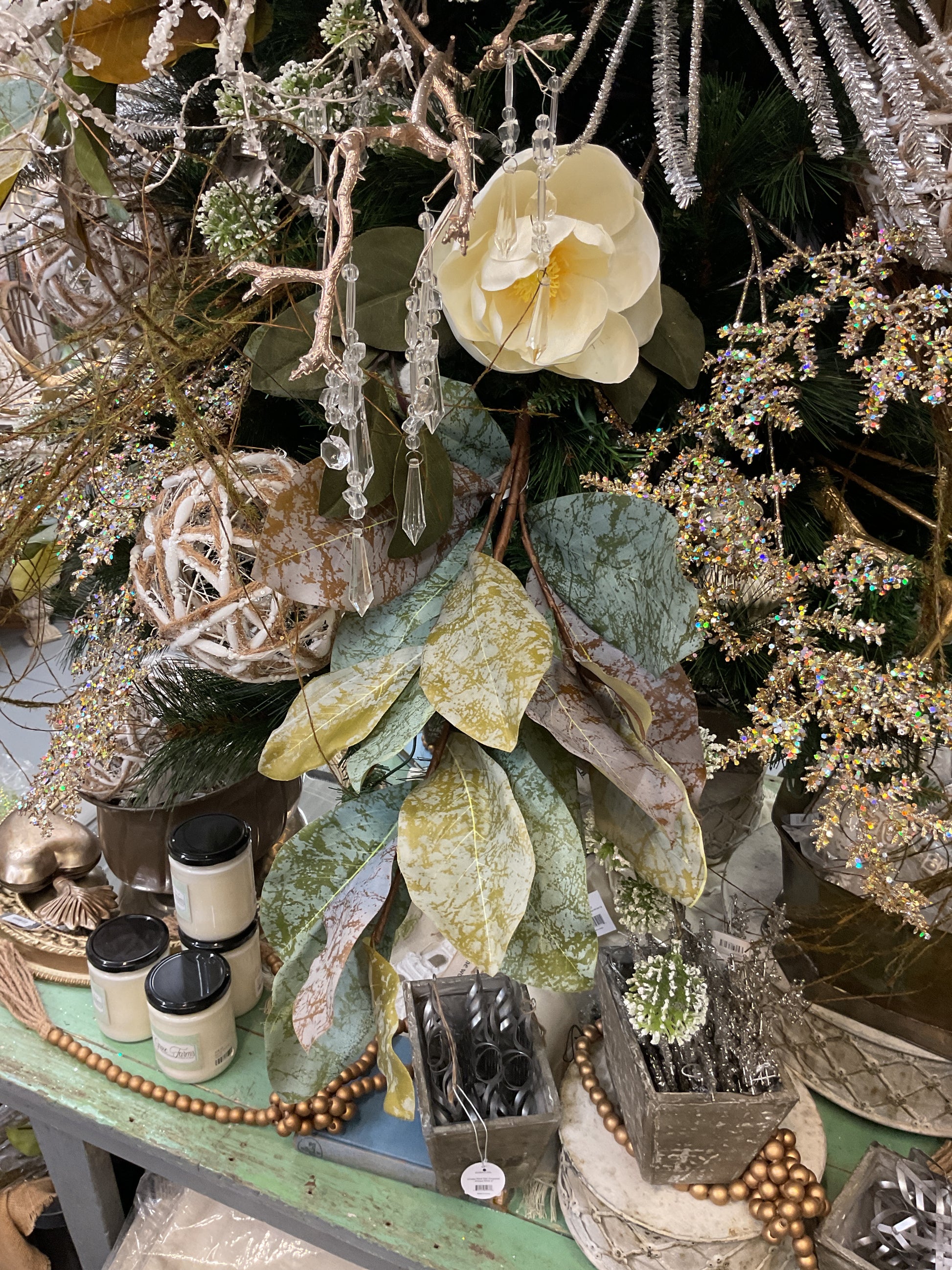 Bring a timeless touch to your seasonal decor with this Green Magnolia Pick. Perfect for fall arrangements or adding a fresh, natural accent to your Christmas decorations, its lush green leaves evoke the charm of French Provence. Ideal for centerpieces, vignettes, Christmas Trees, or mantel displays, this versatile pick enhances any festive setting with elegant simplicity. Elevate your holiday and autumn decor effortlessly with this beautiful, lasting greenery.