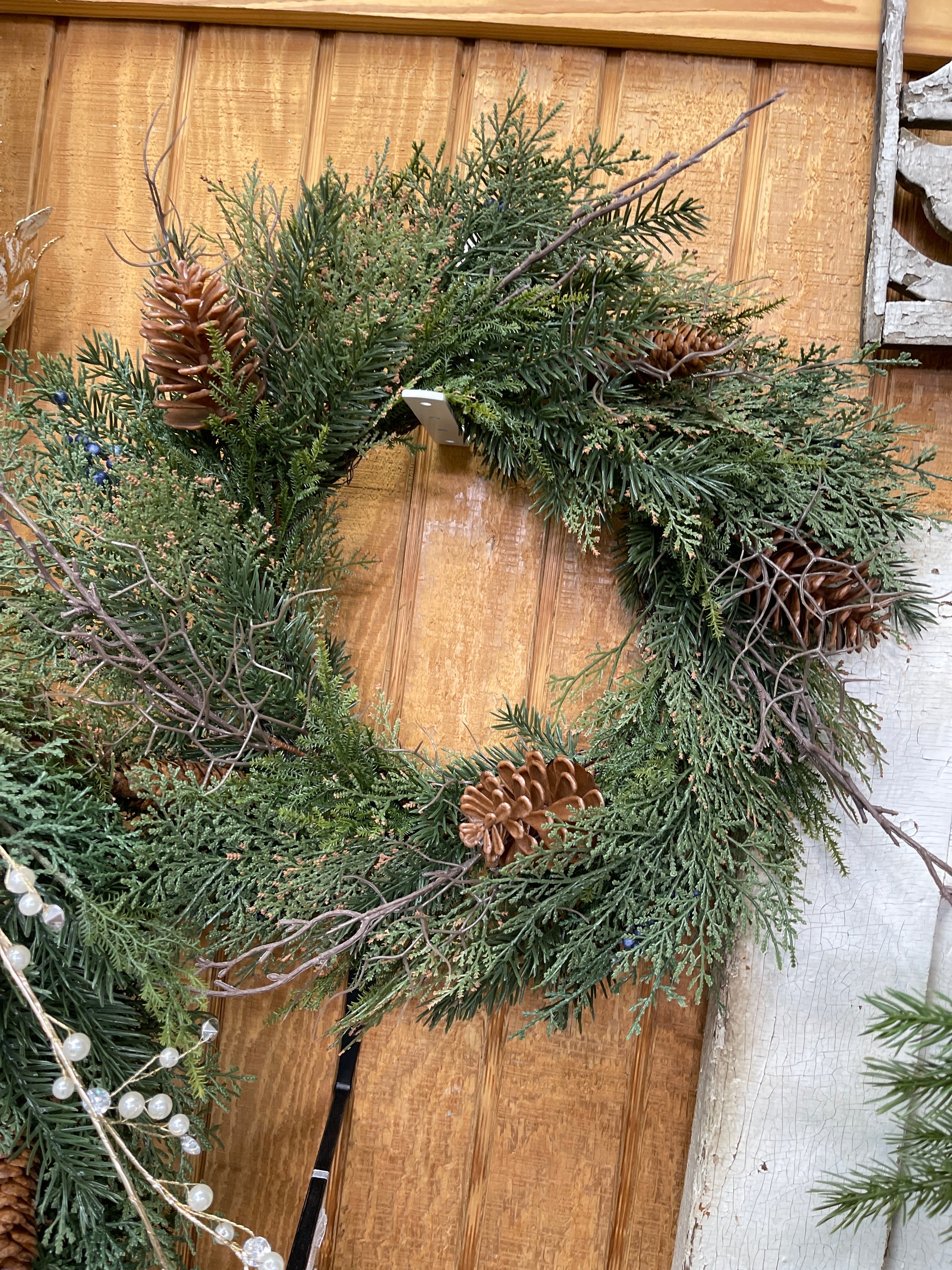 Expertly crafted with large juniper leaves and vibrant blue berries, this wreath is the perfect addition to your holiday decor. The lush greenery compliments the grapevine base, providing a classic and elegant touch. Bring the natural beauty of the outdoors into your home with our Juniper L WR wreath.