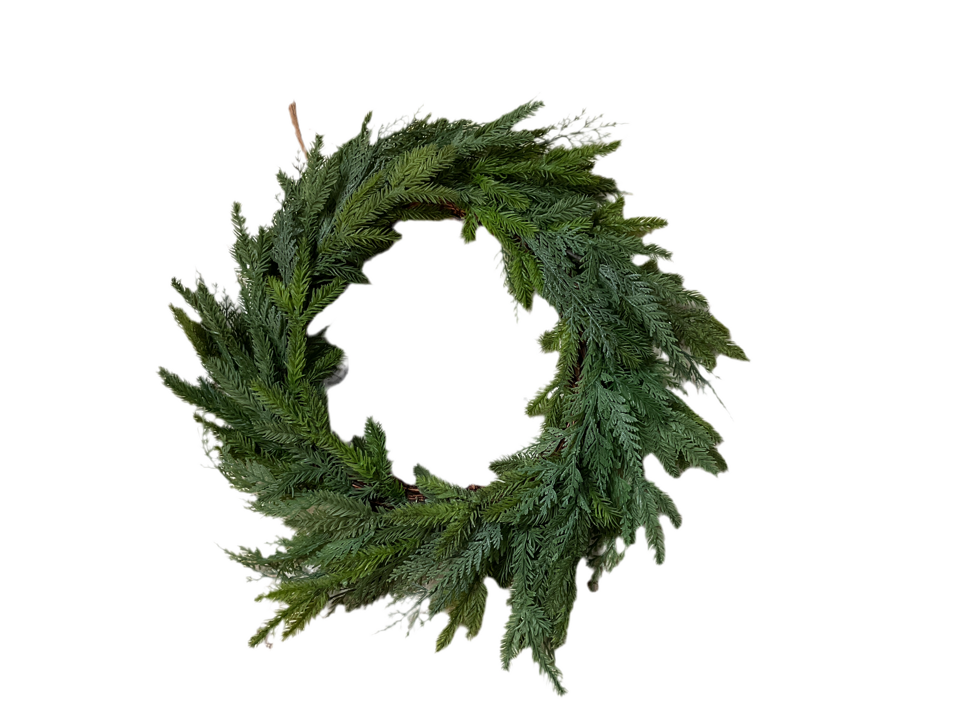 Add a touch of natural elegance to your holiday decor with this stunning Norfolk Cedar Christmas Wreath. Measuring 20 inches in diameter, this handcrafted wreath features lush, lifelike Norfolk cedar branches that bring a festive yet understated charm to any setting.