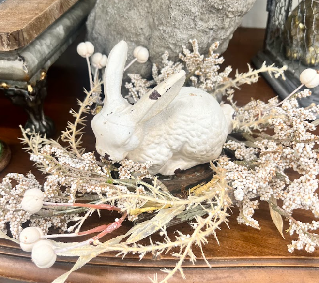 This charming white cast iron bunny, measuring 5" wide, 3" deep, and 4" high, adds a delightful touch to any porch or indoor space. Its sturdy cast iron construction ensures durability, making it a lasting decorative accent that brings warmth and whimsy to your home. Perfect for enhancing your seasonal décor or everyday charm.